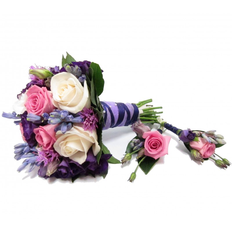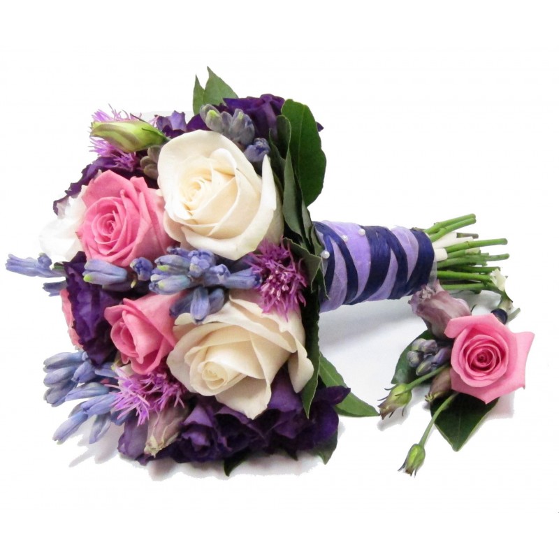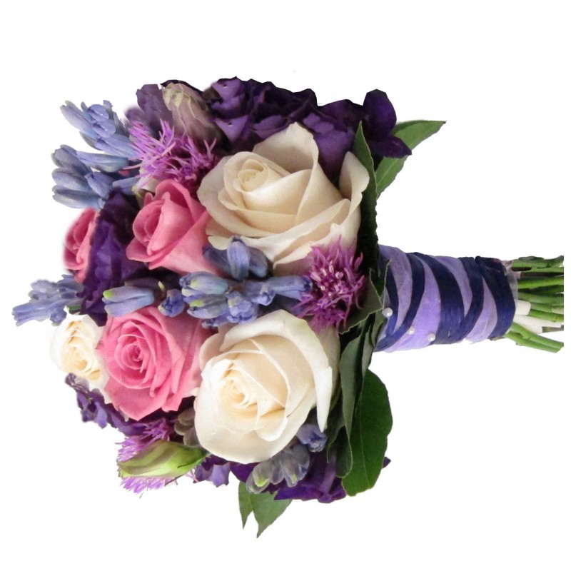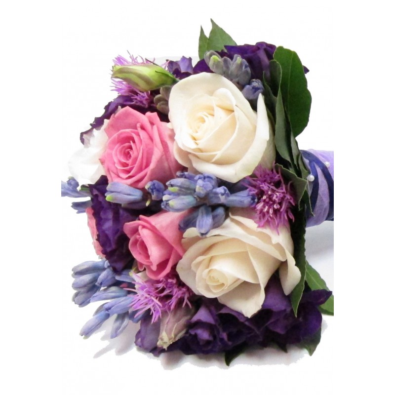 Alegre bouquet de novia de suave colorido en tonos rosas, lilas y azules. Se compone de rosas en dos tonos, jacintos, eustoma y liatris. Cobertura de hojas muy discreta para realzar aún más la combinación de colores.
