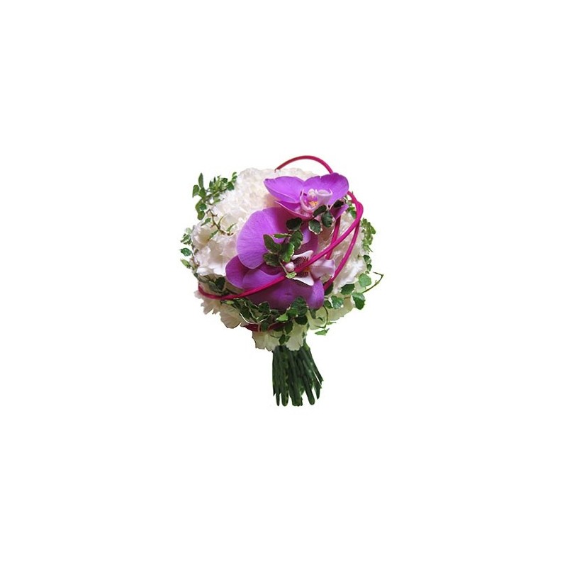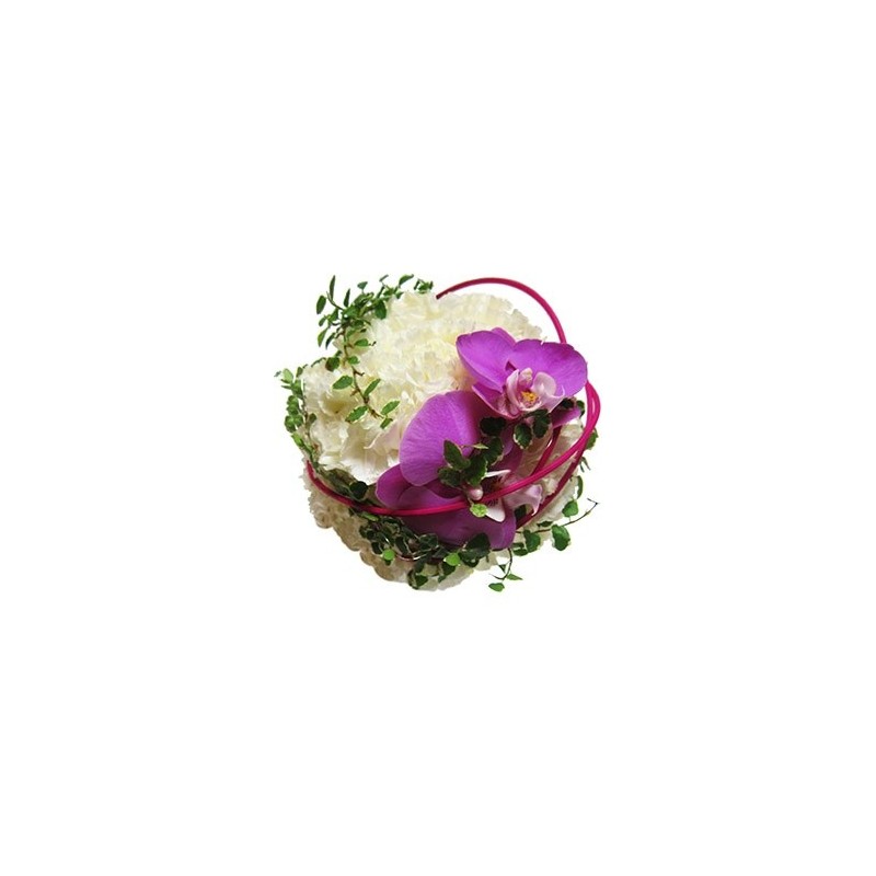 La sencillez del clavel y la elegancia de la orquídea se dan la mano para componer un modelo de ramo distinto y original.