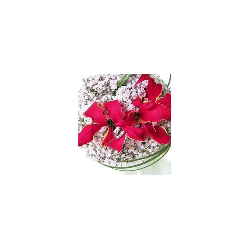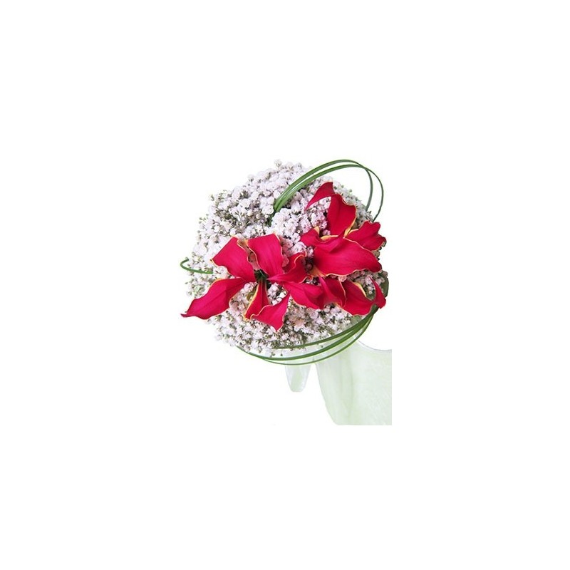 Esponjosa bola de paniculata enriquecida por las flores de gloriosa, que le da un toque muy personal, por su color y forma.