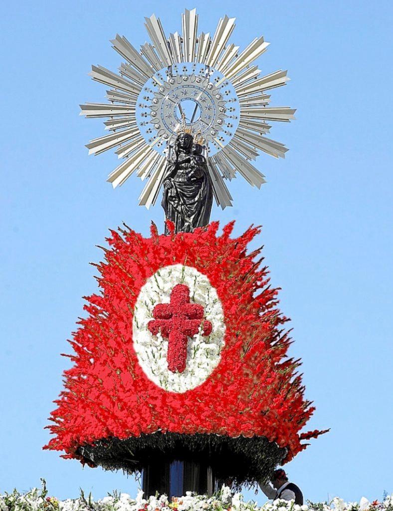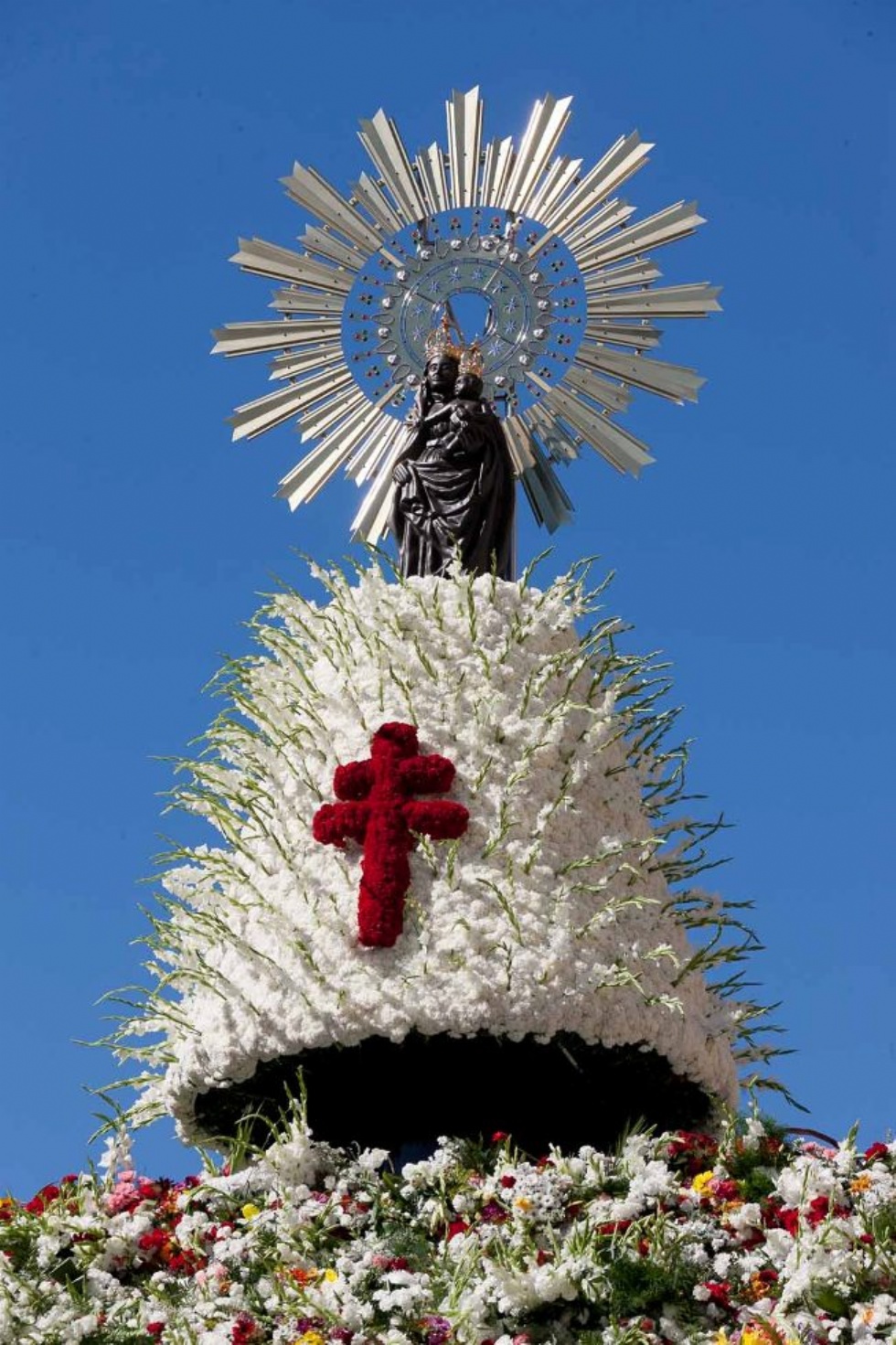 Toda la familia se junta para ver como ese día se cubre a la Virgen con un manto de flores que crece cada año y que tiene en lo alto una cruz elaborada con claveles rojos engarzados en un manto blanco de claveles y gladiolos.