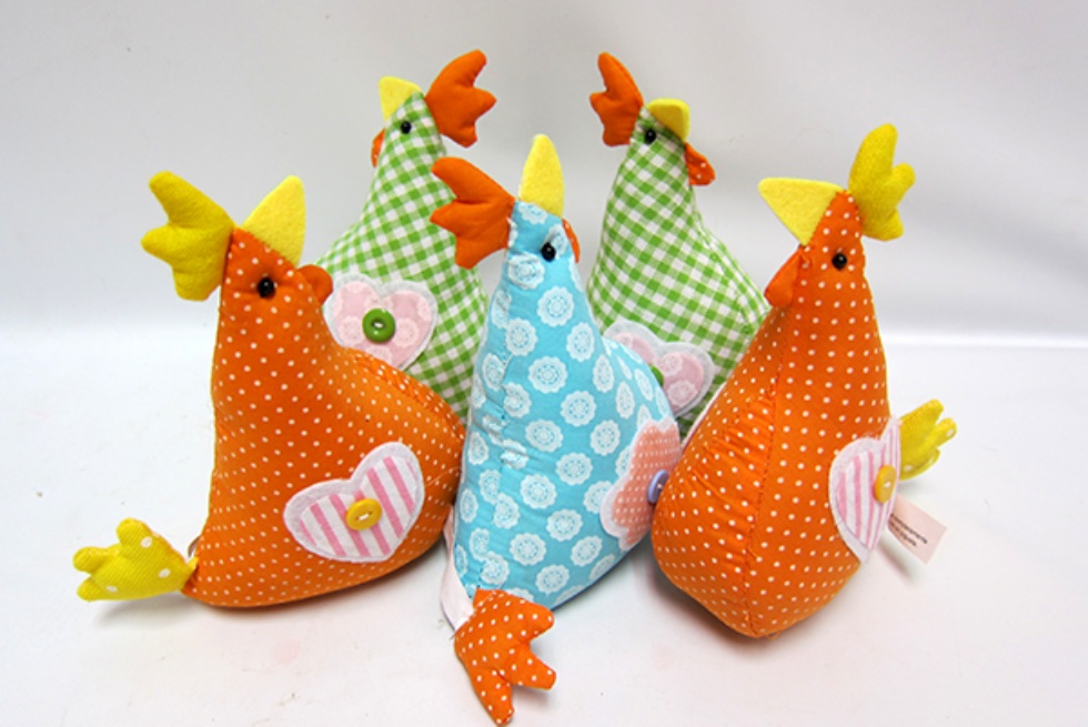 Divertidas gallinas en tonos naranjas, azules y verdes decoradas con botones y flores. Llevan peso en la base para mantenerse erguidas.